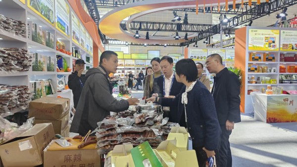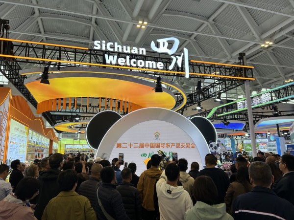 四川综合展示区占地300平方米,以金色稻浪与丰收景象为视觉核心,融合熊猫、三星堆等四川独有的文化符号和流量明星,为采购商、参观群众打造了一个集展示、品鉴、洽谈和产销对接于一体的沉浸式体验空间。参展产品涵盖粮油、畜禽、水果、茶叶、调味品、休闲食品等200余个品种。