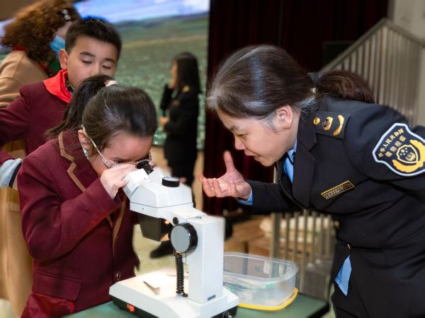 活动现场,检疫人员创新科普形式,首先通过播放《红火蚁军团覆灭记》动画短片,生动形象地展示了红火蚁的传播途径、基本特征和危害。其次,在科普PPT讲解过程中,带领学生们通过显微镜观察红火蚁标本,直观了解其形态特征,进一步加深对红火蚁的认识。