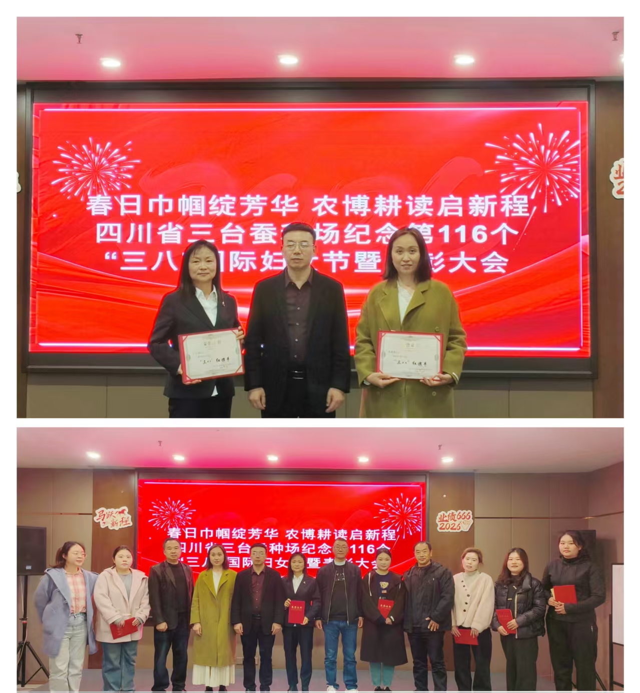 活动之初,场领导班子为荣获2025年度“三八”红旗手和优秀女职工称号的8名同志颁发荣誉证书。丁小娟、冯海燕获评“三八”红旗手,刘万巧、李应菊、涂钰羚、李洋、杨玉梅、侯利君获评优秀女职工。她们中,有夜以继日守护种质资源的“种业卫士”;有在显微镜下搜寻微粒子孢子的“质检尖兵”;有在蚕房育种架前守望蚕卵破壳的“生命守护者”……先进代表丁小娟、李洋分享成长感悟,真挚话语引发全场共鸣。