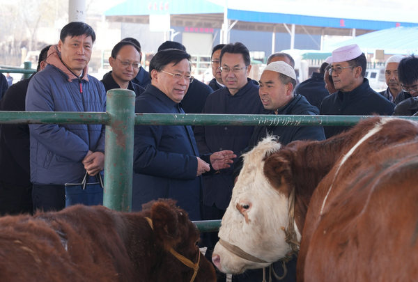 肉牛肉羊是甘肃的主导产业之一,韩俊来到临夏州康乐县牛羊交易市场,与市场负责人、经纪人、饲料经销商、养殖户等交流,询问市场行情、养殖收入、饲草供应、屠宰加工等情况。他还来到附城镇刘家庙村鑫隆肉牛养殖合作社,调研了解肉牛养殖情况。得知去年以来甘肃针对肉牛养殖亏损,出台一系列有力有效政策举措,养殖场户普遍实现盈利,韩俊予以肯定。他强调,要健全良种繁育体系,抓好肉牛肉羊品种改良,全环节推进肉牛肉羊产业高质量发展。要发展优质饲草料生产,提高标准化规模化养殖水平。要切实抓好养殖粪污处理,采取粪肥还田、生产有机肥等方式进行资源化利用,促进种养循环发展。要毫不松懈抓好重大动物疫病防控,严格检疫监管,保障产业持续健康发展。