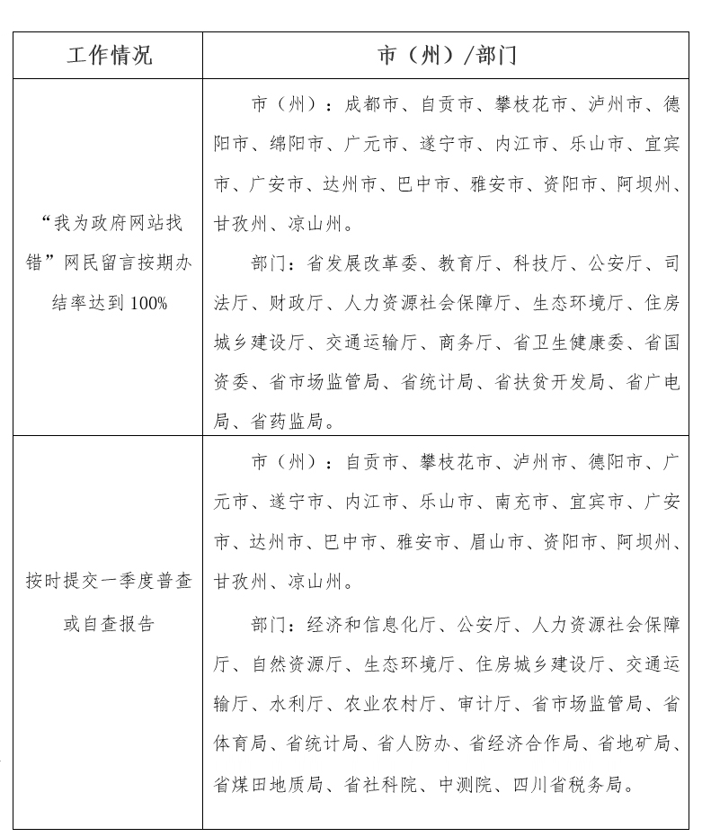 第一季度,省政府办公厅组织力量采取技术和人工相结合方式,随机抽查、复查各地各部门政府网站570个(含2018年第四季度存在突出问题的政府网站),抽查比例55.7%,总体合格率98.8%。经复核,成都市食品药品监督管理局、泸州市质量技术监督局、南充市质量技术监督局等7个网站存在突出问题,自贡、攀枝花、德阳、绵阳、广元等15个市(州)政府网站和省发展改革委、经济和信息化厅、教育厅等56个省直部门网站抽查合格率100%。