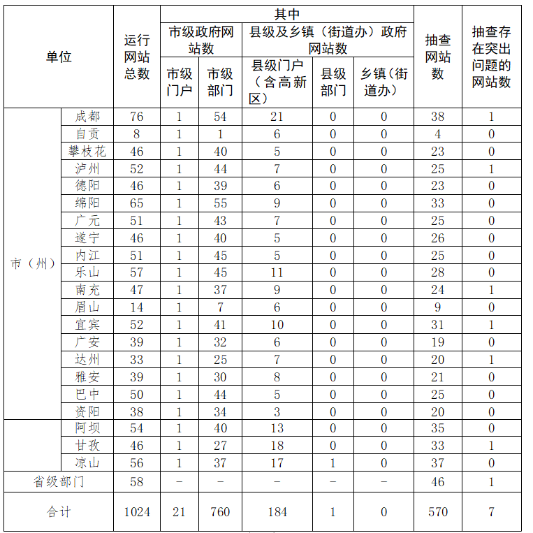 截至3月11日,我省正在运行的政府网站1024个。其中,省政府门户网站和省直部门网站58个,市(州)政府门户网站21个,市(州)部门网站760个,县级政府门户网站184个(含1个高新区网站),县级部门网站1个。