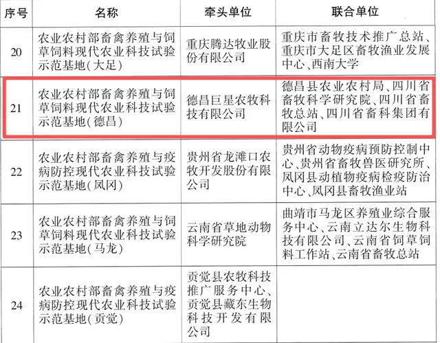 近日,农业农村部办公厅正式公布第一批现代农业科技试验示范基地名单。德昌巨星农牧科技有限公司申报的“农业农村部畜禽养殖与饲草饲料现代农业科技试验示范基地(德昌)” 成功入选。